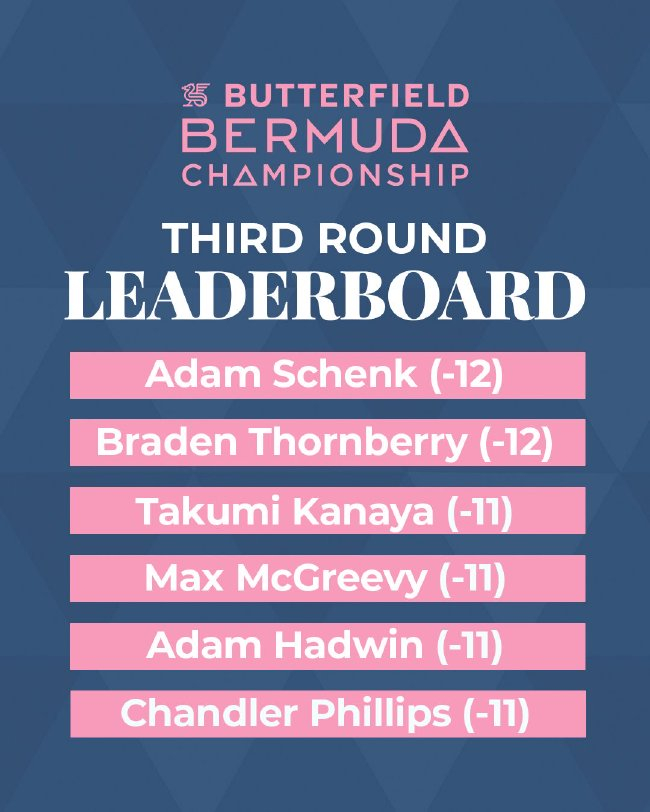 领先榜前11名选手中有10人与两位领先者境遇相同:他们在抵达百慕大时联邦快递杯排名均未进入前100,百慕标赛伯里落后一杆的大锦集团包括:36洞领先者加拿大球员亚当-哈德文(Adam Hadwin)。而扭转局势的申克索恩时间所剩无几。70杆)和日本选手金谷拓实(66杆)并列位于第三位。